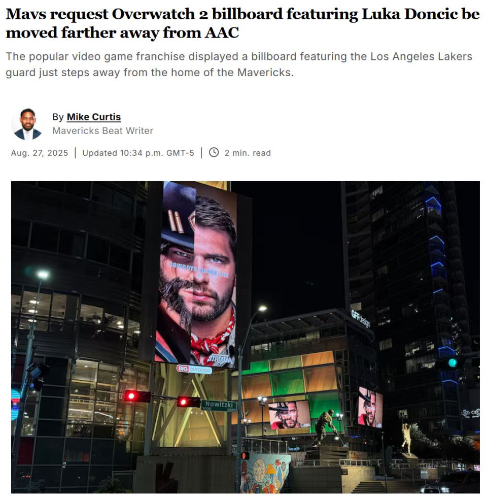 据《达拉斯晨报》记者Mike Curtis报道,湖人队球星东契奇的《守望先锋2》广告宣传已经遍布全美,尤其是在他的前东家——达拉斯独行侠队的主场球馆美航中心附近,这些广告牌尤为引人注目。然而,这一看似常规的商业推广活动却很快引发了独行侠队的不满。